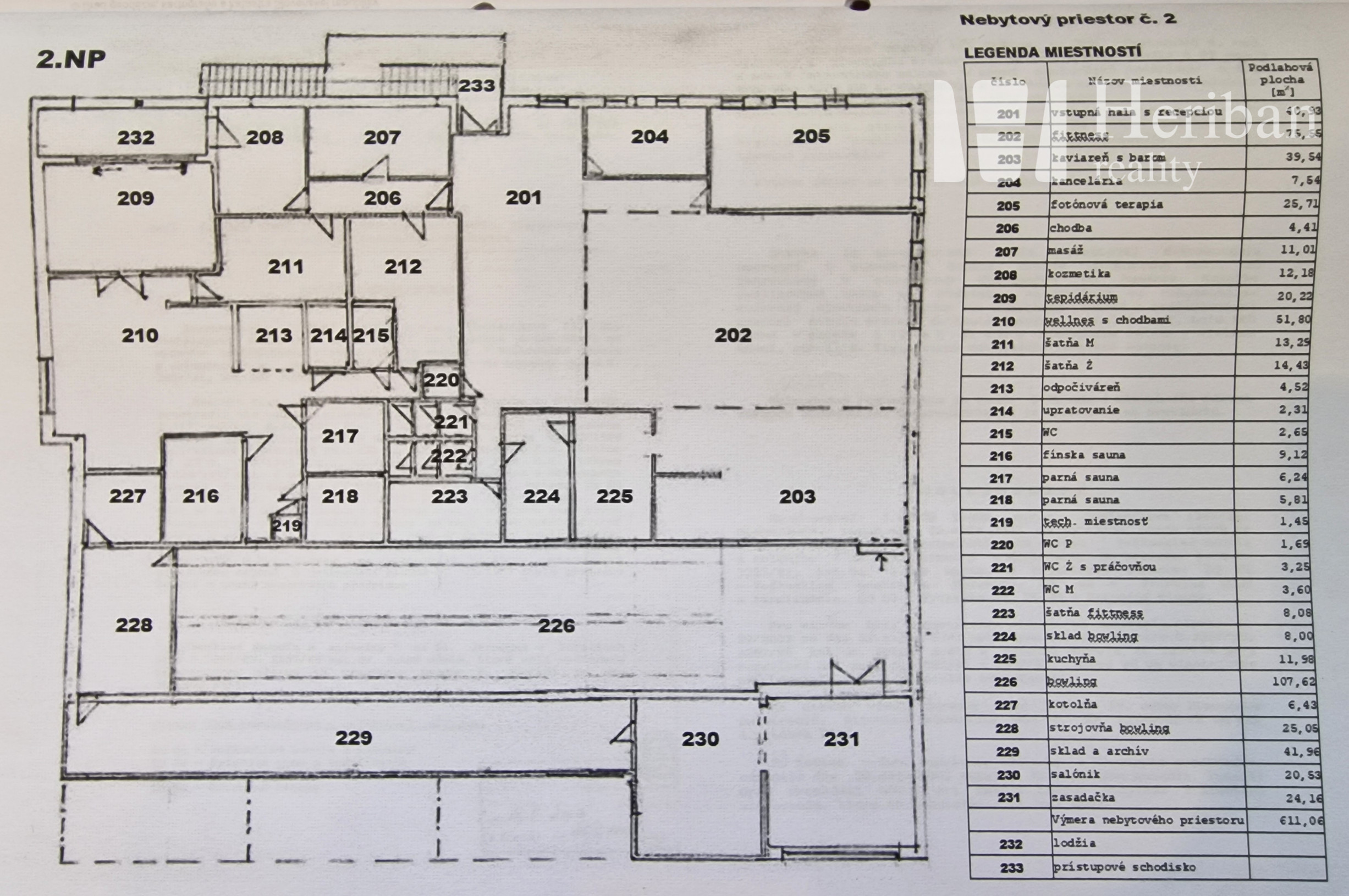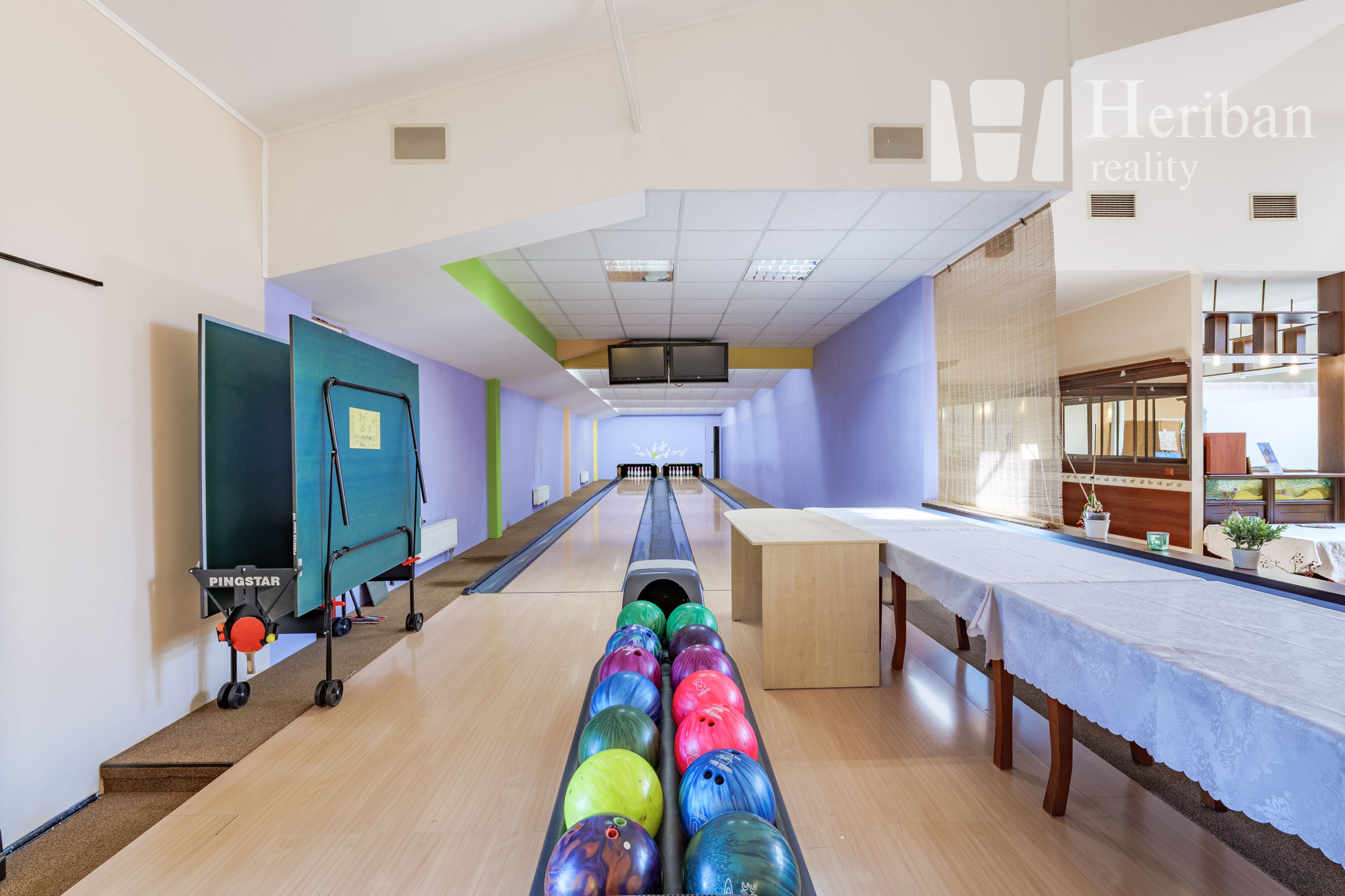 -vstupná hala s recepciou, fitness, kaviareň s barom, kancelária, fotónová terapia, chodba, masáž, kozmetika, tepidárium, welness, 3x sauna, 3x šatňa, odpočívareň, upratovanie, 4x WC, techn.miestnosť, sklad bowlingu, 2 bowling.dráhy, kuchyňa, kotolňa, strojovňa bowling, archív, salónik, zasadačka, lodžia, prístupové schodisko.