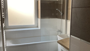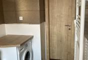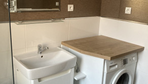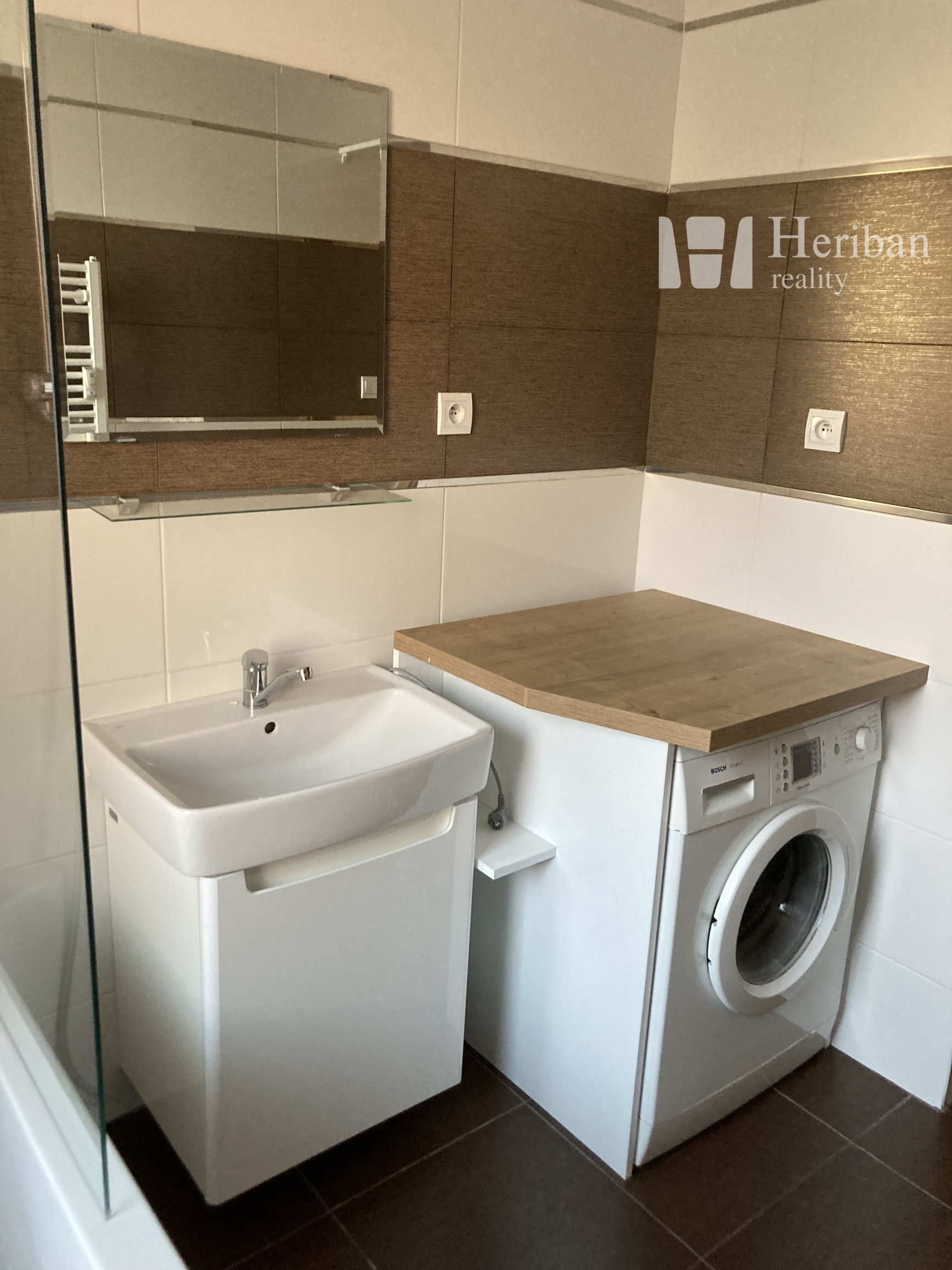 -v kúpelni: vaňa so zástenou, umývadlová skrinka s umývadlom, zrkadlo, práčka zn. BOSCH