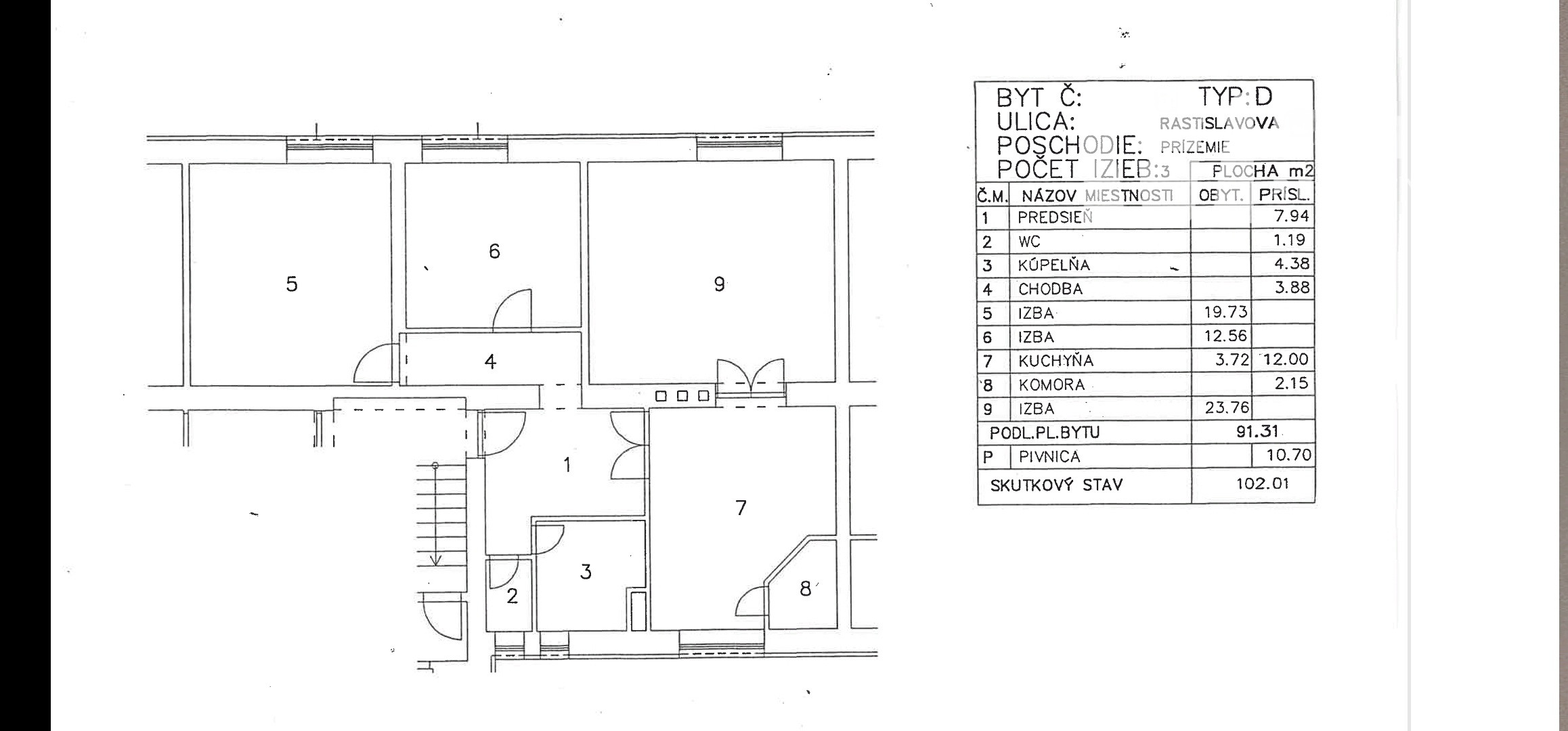 3 izbový byt má úžitkovú plochu 91m2+11m2 pivnica, nachádza sa na vyvýšenom prízemí s okami izieb do dvora, v zateplenom tehlovom bytovom dome.